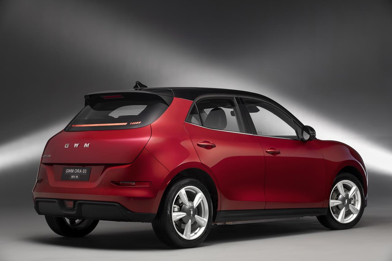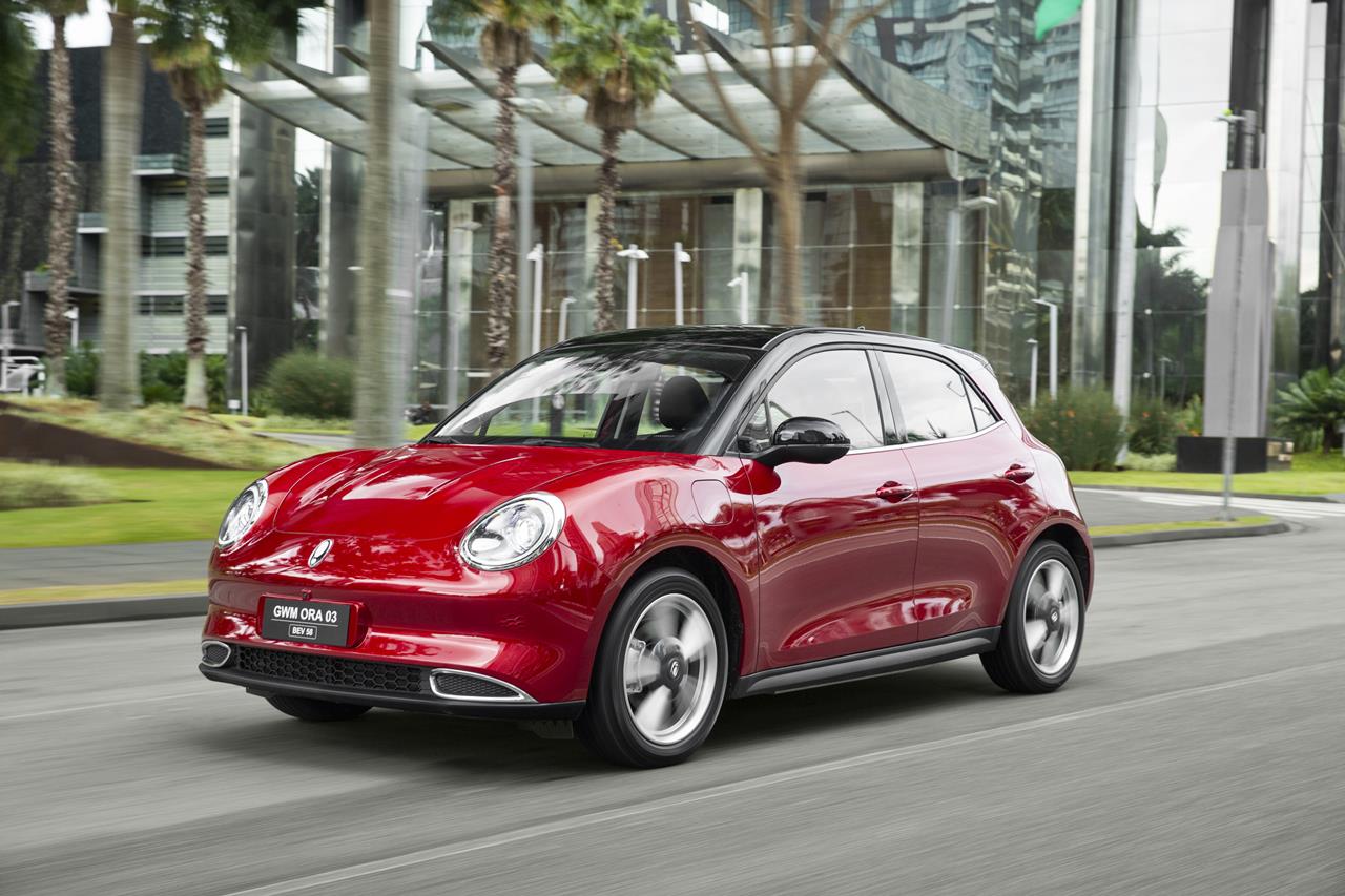 O GWM ORA 03 BEV58 estará disponível em quatro opções de cores: Azul Copacabana, Vermelho Brava, Branco Ágata e Preto Hematita.