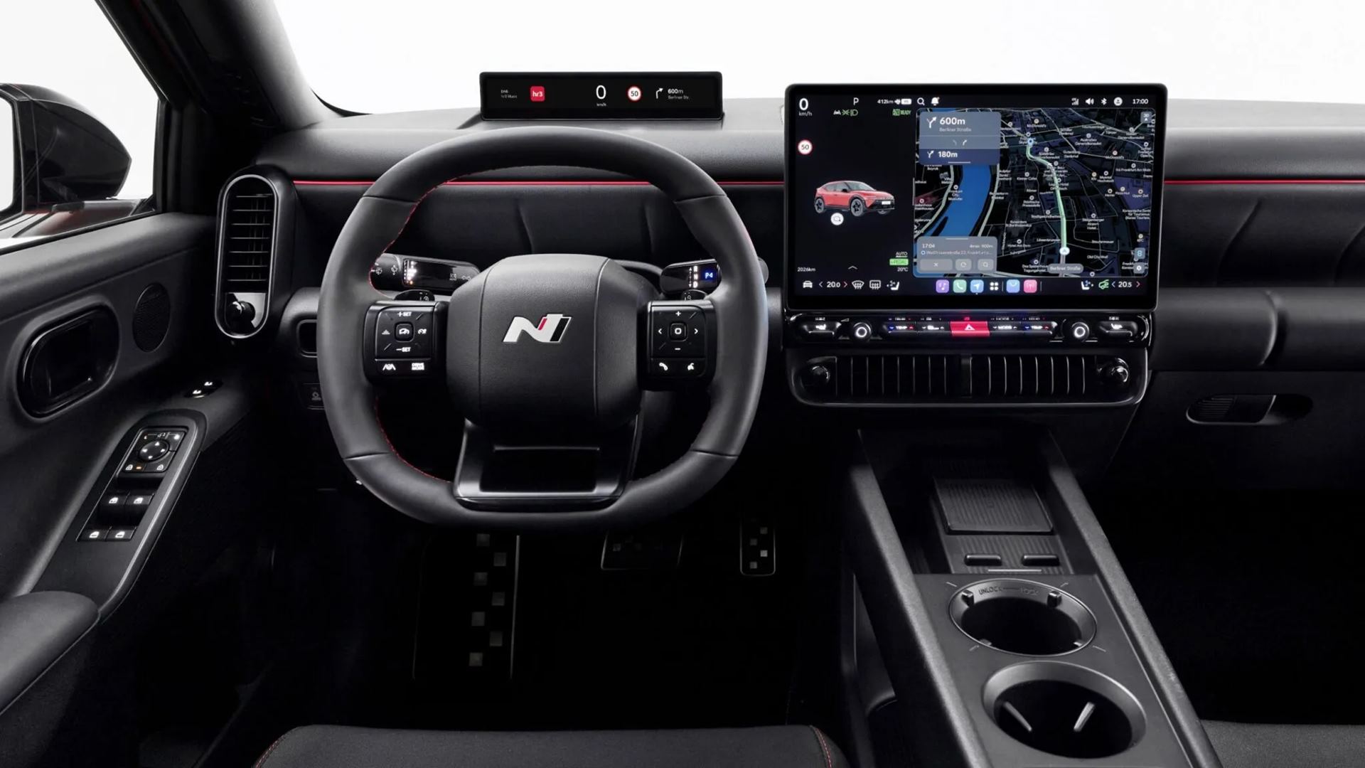 Por dentro também o Hyundai Ioniq 3 é exótico, seu painel tem estilo minimalista com linhas horizontais e que também devem dividir opiniões, o painel de instrumentos é composto por uma pequena tela colocada separada acima do painel, contrastando com a tela gigante de 14,6 polegadas da central multimídia no cetro do painel.