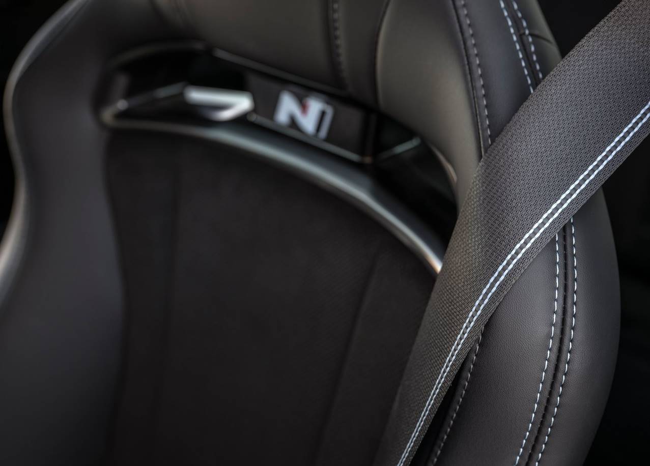No interior, bancos bucket em Alcantara e couro, volante N Pasubio com botões dedicados, pedais metálicos e iluminação ambiente sincronizada criam um cockpit focado no piloto. Cores externas incluem Performance Blue Pearl e Serenity White Pearl, com cabine preta e accents azuis.