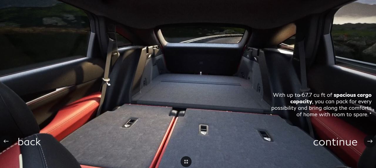 Seu porta‑malas oferece tamanho gigante de quase inacreditáveis 1,014 litros, alcançando 1,917 litros com o banco traseiro rebatido. Mas o porque deste porta malas tão grande ? A resposta é simples, o fato do QX65 usar a mesma base do QX60 que tem sete lugares.