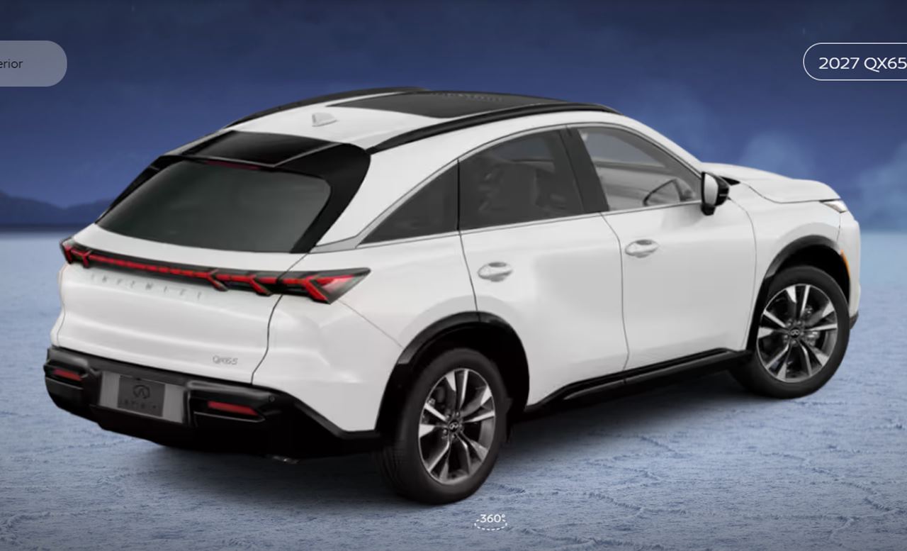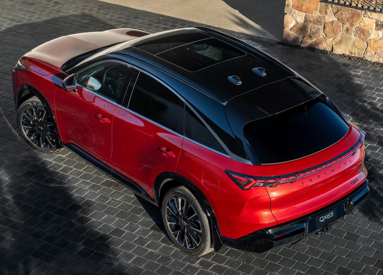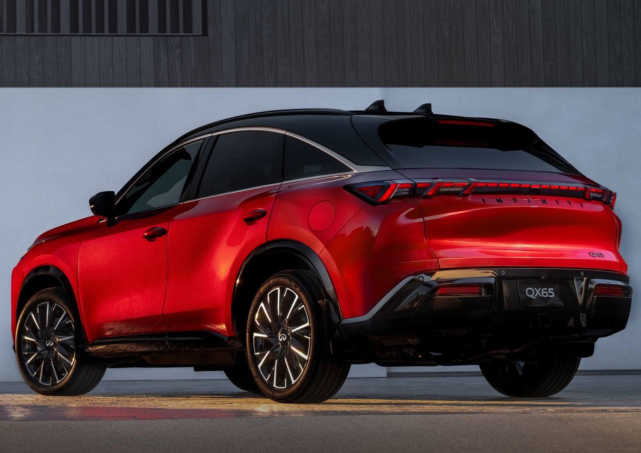 O QX65 chega como um crossover de luxo de grande‑porte, com cinco lugares e linha de teto arqueada tipo “sportback”, que reforça seu caráter esportivo e mais jovem, contrastando bastante com os demais carros da marca que têm uma proposta mais “conservadora”.