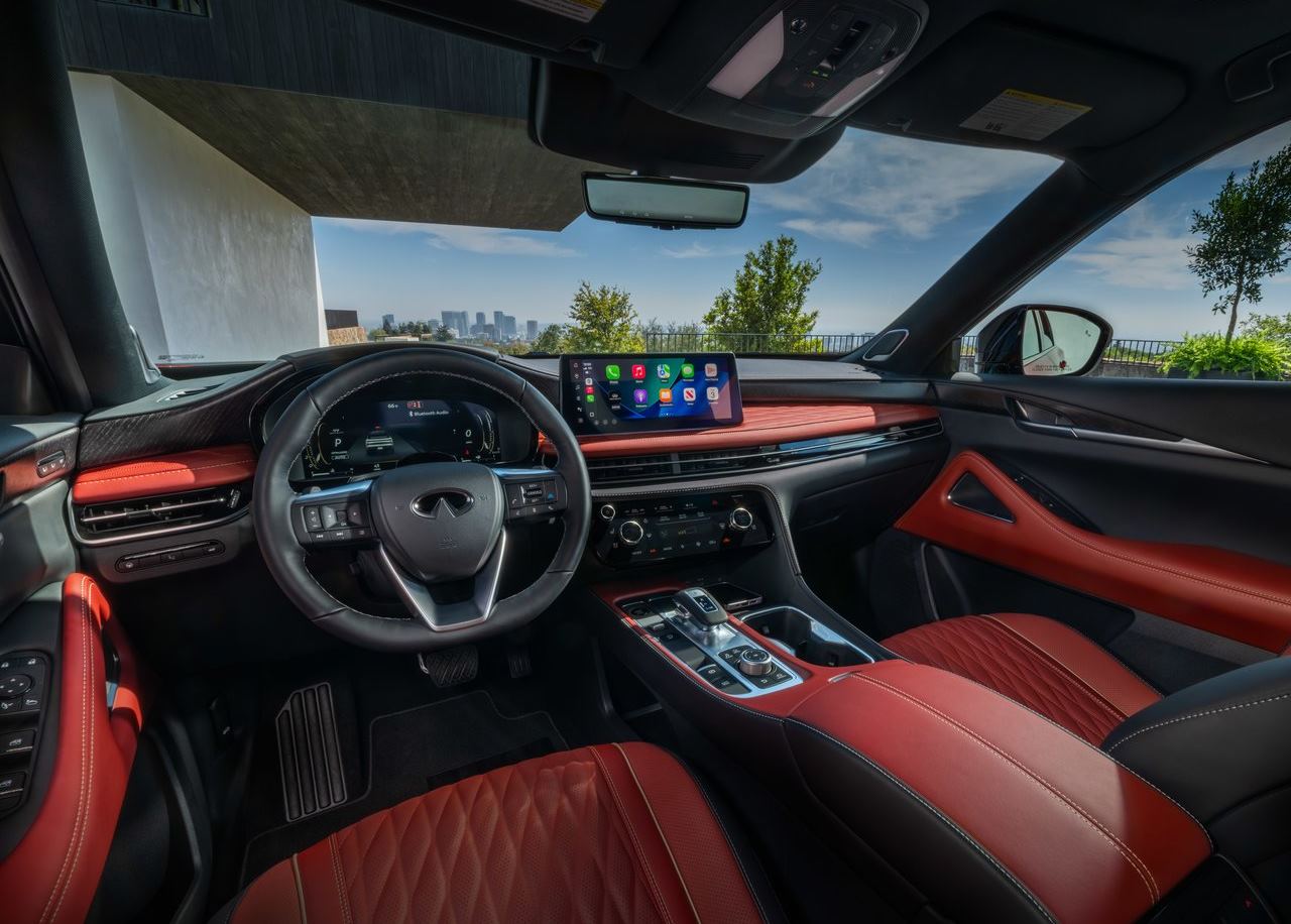 Por dentro o QX65 2027 faz jus a tradição de luxo da Infinti, o SUV coupé conta com uma cabine rica em detalhes trazendo por exemplo madeira real no painel e bancos com couro acolchoado.
