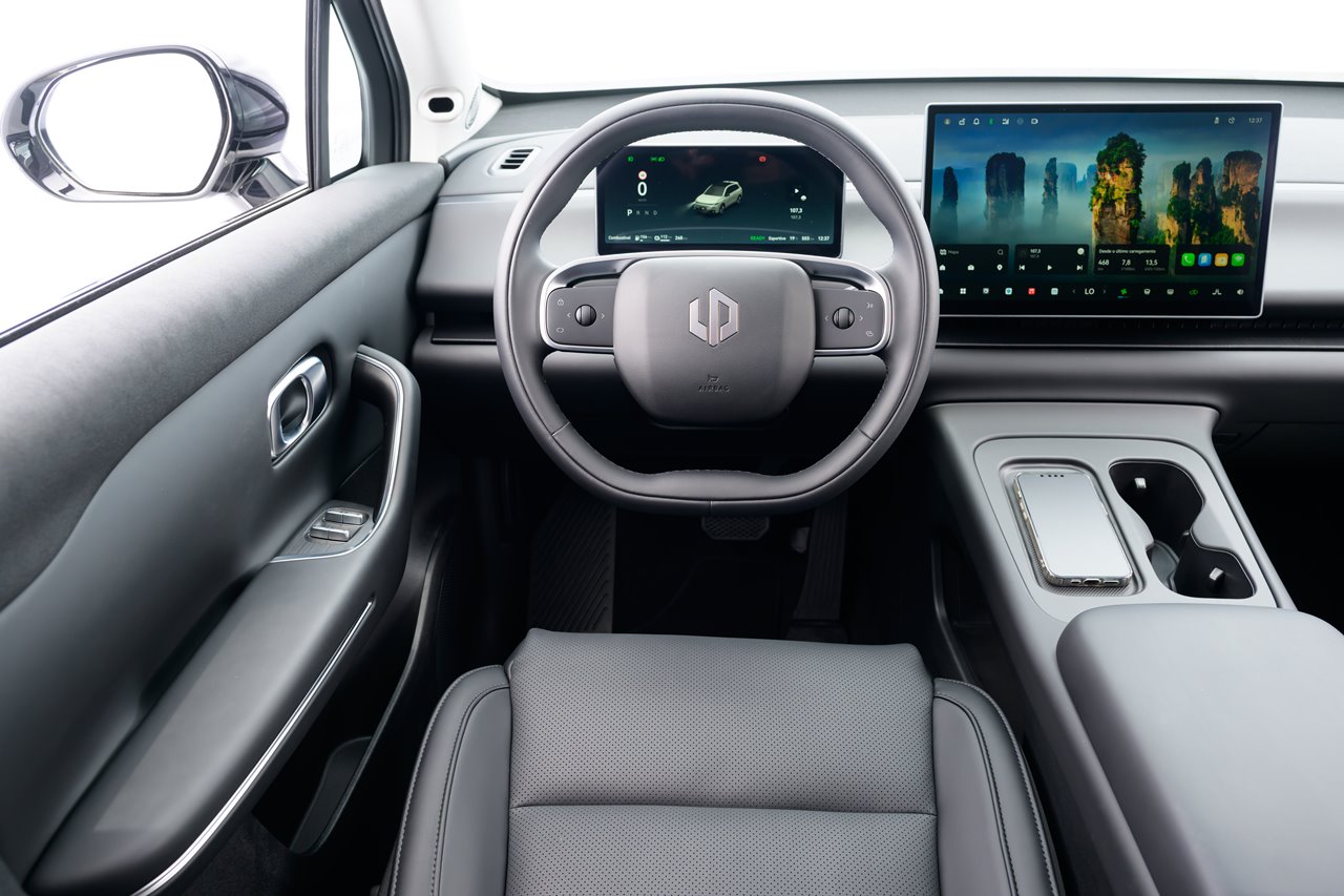 Um ponto negativo é justamente o Leapmotor trazer o padrão chinês de interior, onde há um painel minimalista com literalmente nenhum botão físico, sendo tudo controlado pela central multimídia, o que não agrada a todos, principalmente ao publico mais velho, já que para praticamente tudo você depende da tela.