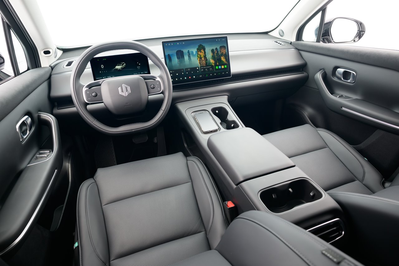 O interior do Leapmotor C10 aposta em tecnologia e conforto de alto padrão, com painel dominado por duas telas — uma digital de 10,25” para instrumentos e uma central multimídia flutuante de 14,6” com sistema Leapmotor OS 4.0 que integra os controles por comandos por voz.