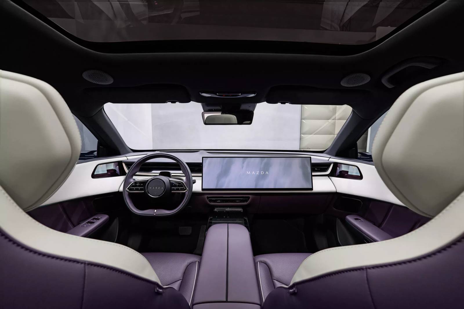 Enquanto o interior oferece três esquemas de cores (bege Warm Beige/preto ou Amethyst & White Maztex) e amplo espaço para passageiros traseiros, chama atenção também o perfil dos bancos esportivos com encostos de cabeça embutidos com alto-falantes de de série.