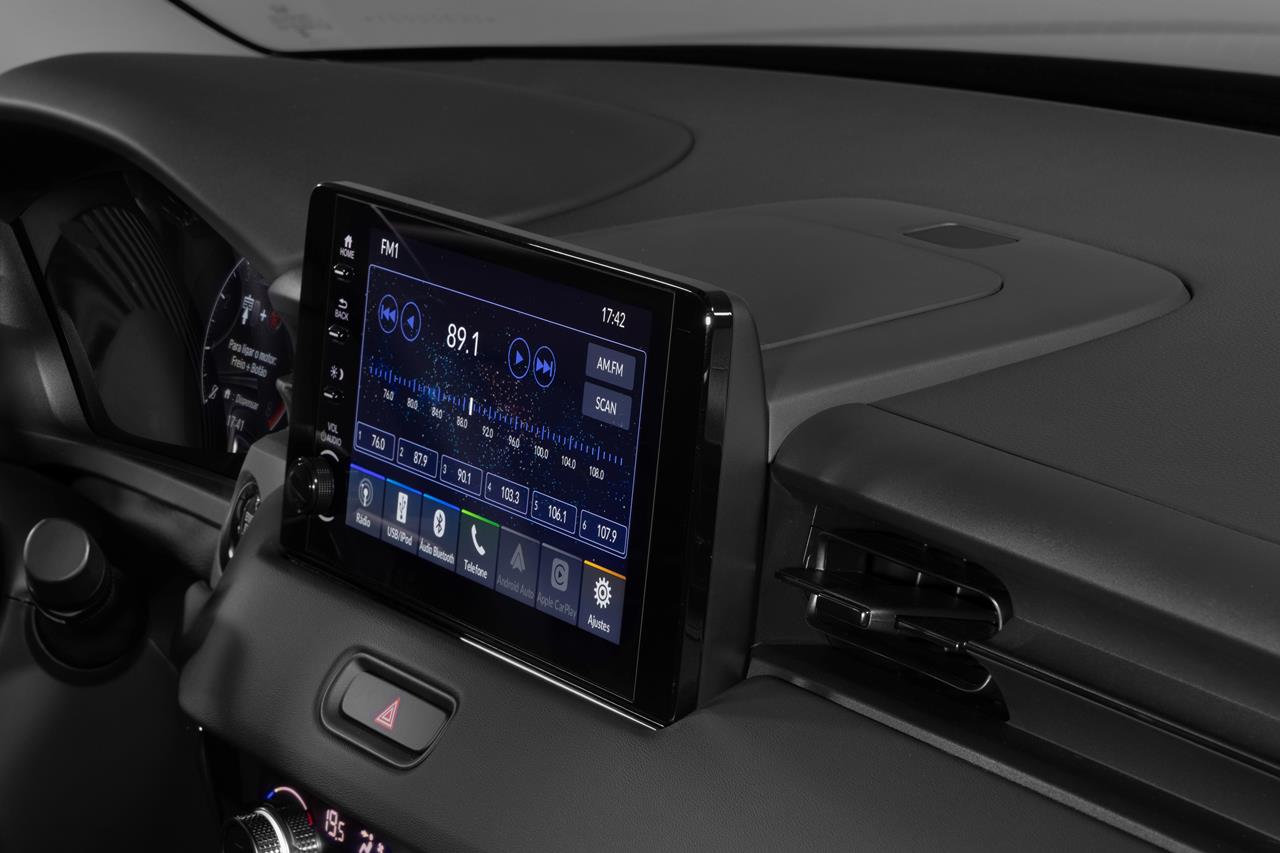 Por dentro, a Honda ouviu algumas das principais reclamações dos donos de HR-V, o modelo 2026 mudou o formato da multimídia, saiu aquela central polêmica com tela que mais parecia uma TV de tubo, para dar lugar a uma tela de aspecto mais moderno e minamlista, agora com estrutura do tipo flutuante, o que deixou o painel com um estilo mais agradável e limpo. Mas infelizmente a multimídia do HR-V seguiu tendo apenas 8 polegadas, é uma das menores da categoria.