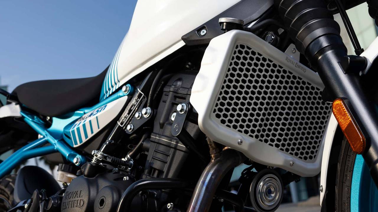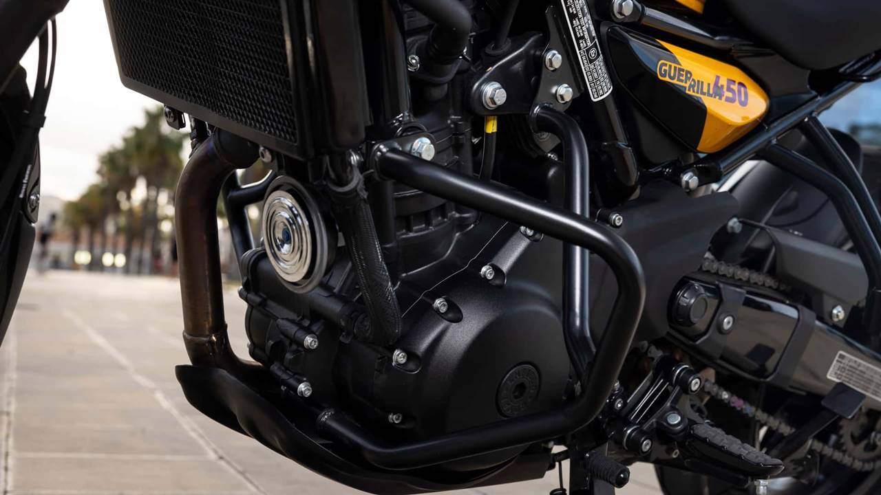A Royal Enfield Guerrilla 450 apresenta o motor Sherpa de 452 cm³, monocilíndrico, refrigerado a líquido com um enorme radiador frontal, tem comando de válvulas DOHC com quatro válvulas, que entrega bons 40 cavalos de potência a 8.000 rpm e torque de 4 kgf.m a 5.500 rpm, garantindo uma pilotagem dinâmica e prazerosa tanto em trajetos urbanos quanto em viagens.