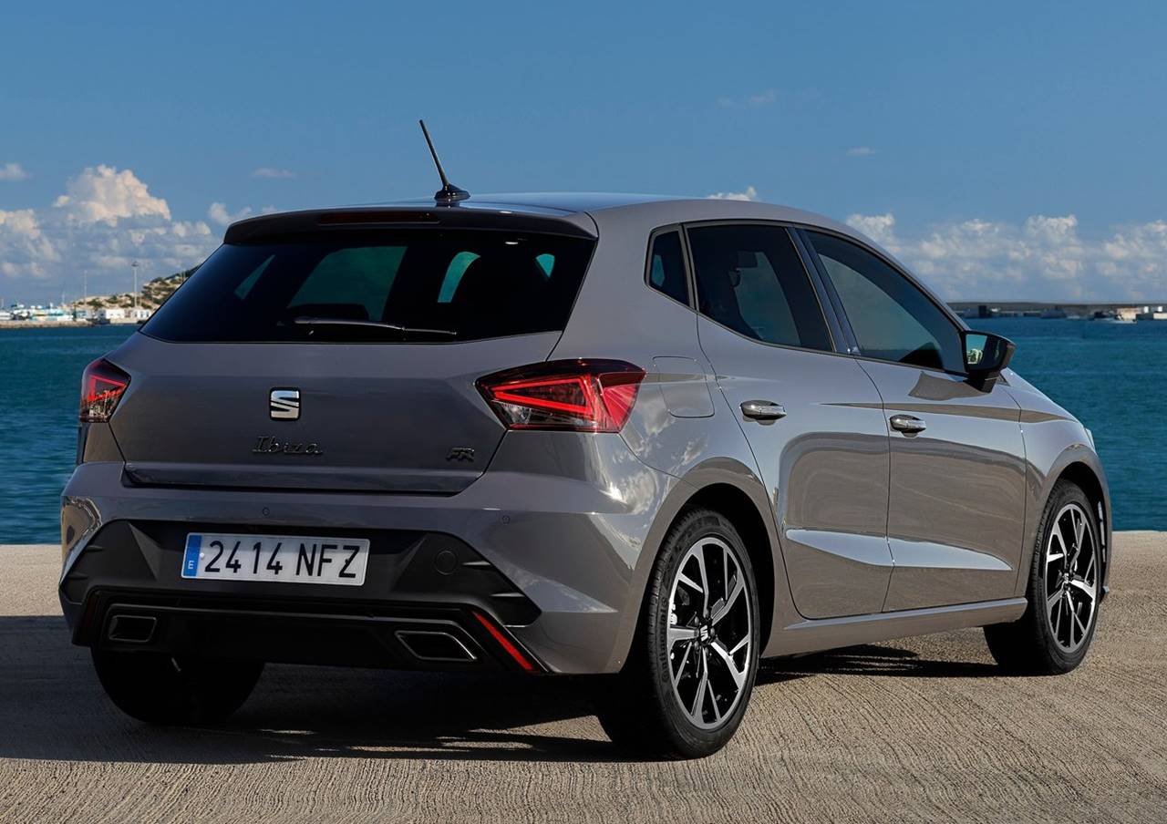 Na traseira, as luzes agora são em LED em todas as versões, e o para-choque foi redesenhado recebeu um aplique escurecido e duas saídas falsas de escapamento visíveis que reforçam o visual esportivo do novo Seat Ibiza.
