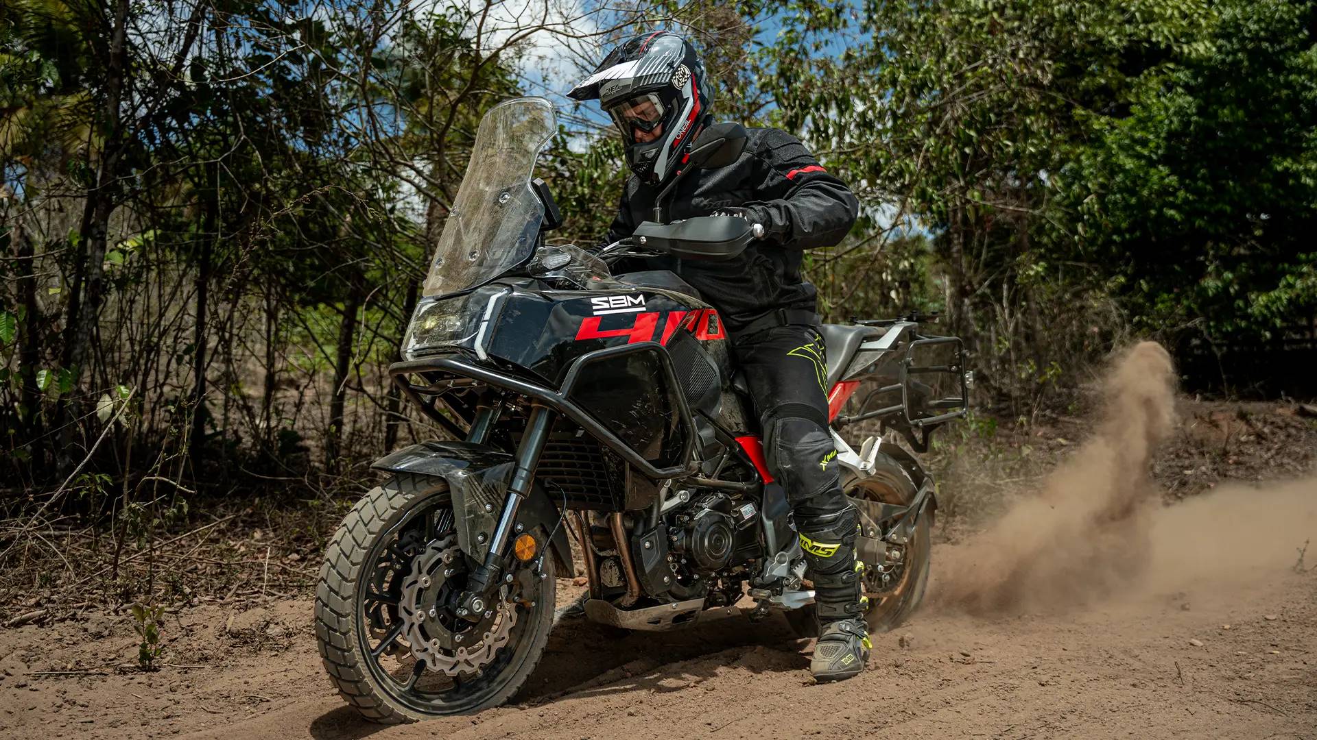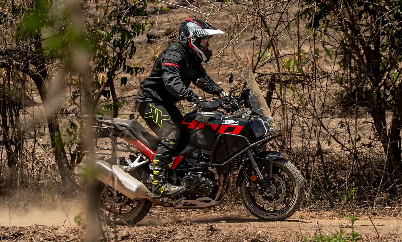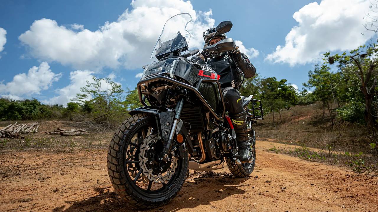 A SBM 400SS exibe visual aventureiro com farol full LED triplo com DRL e desenho retangular, bolha ajustável em altura, protetores de motor e para as mãos, baús laterais de fábrica e paralama traseiro alto.