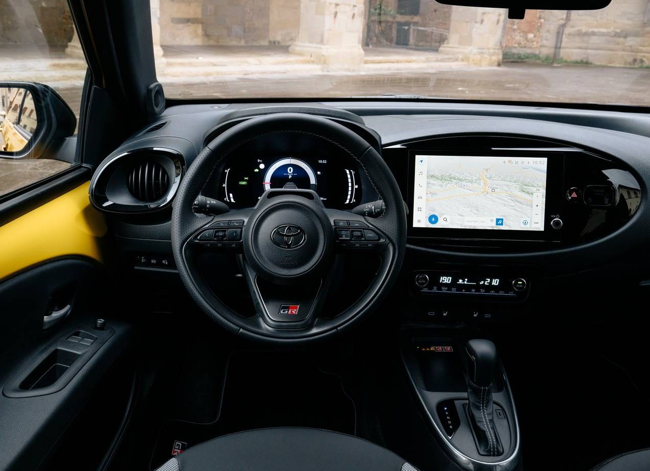 Por dentro a novidade é o novo painel digital de 7 polegadas, além da central multimídia de 9 polegadas com Apple CarPlay/Android Auto sem fio, há ainda um carregador sem fio para smartphones no console. Apesar de ser atualmente o carro mais barato da Toyota na Europa o Aygo X tem aspecto de carro premium, pode vir com ar-condicionado automático dual zone, teto solar panorâmico, transmissão automática CVT, até uma versão esportiva GR Sport.