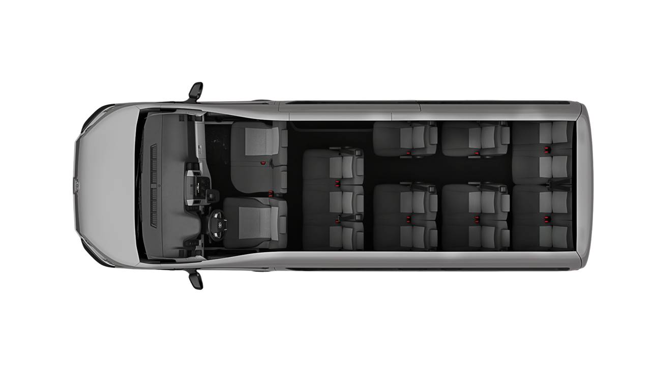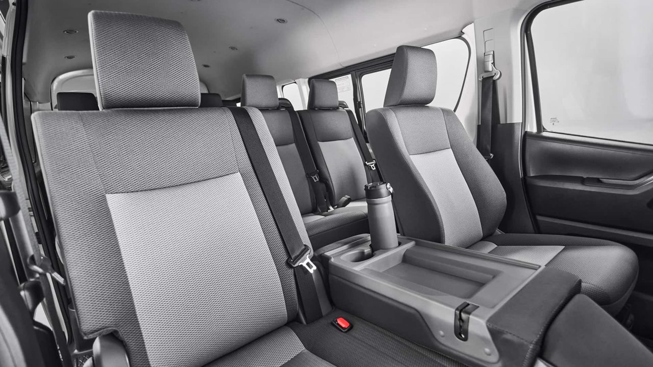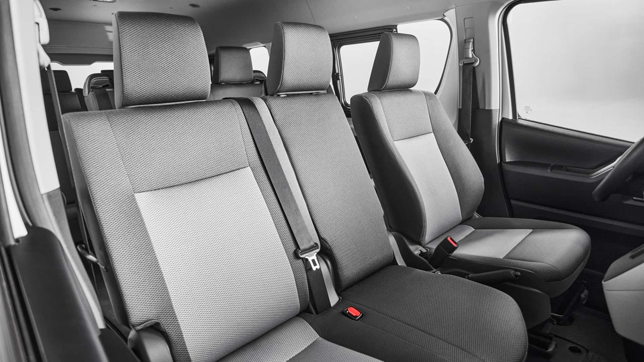 A Hiace Minibus tem a seguinte disposição interna “3+3+3+3+4”, sendo que a partir da terceira fileira há um corredor central entre os bancos que divide as fileiras na disposição 1/2, disposição similar a de vans como Ducato e Sprinter. A última fila de bancos conta com 4 assentos e pode ser dobrada ou removida para aumentar a capacidade de bagagens se necessário.