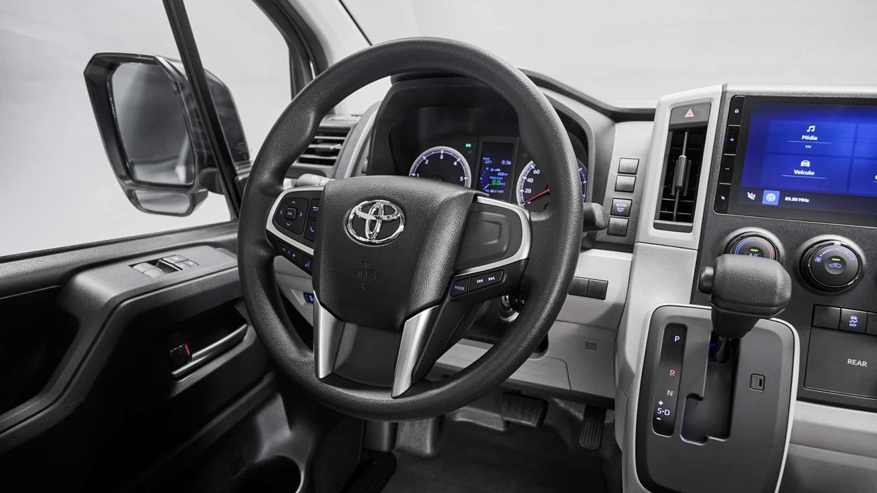 O desenho do painel agrada, há diversos porta objetos espalhados pela cabine, a alavanca de câmbio fica integrada ao painel, o que facilita a vida de quem viaja no banco central frontal, outro destaque é o sistema multimídia com tela de 9 polegadas também ofertado de série. O banco central pode ser rebatido quando não estiver sendo utilizado, virando um console central com porta copos e mesa de apoio. O acabamento também agrada, combina dois tons de cinza, no Brasil a Hiace terá apenas bancos em tecido, o que não é muito legal pensando na limpeza.