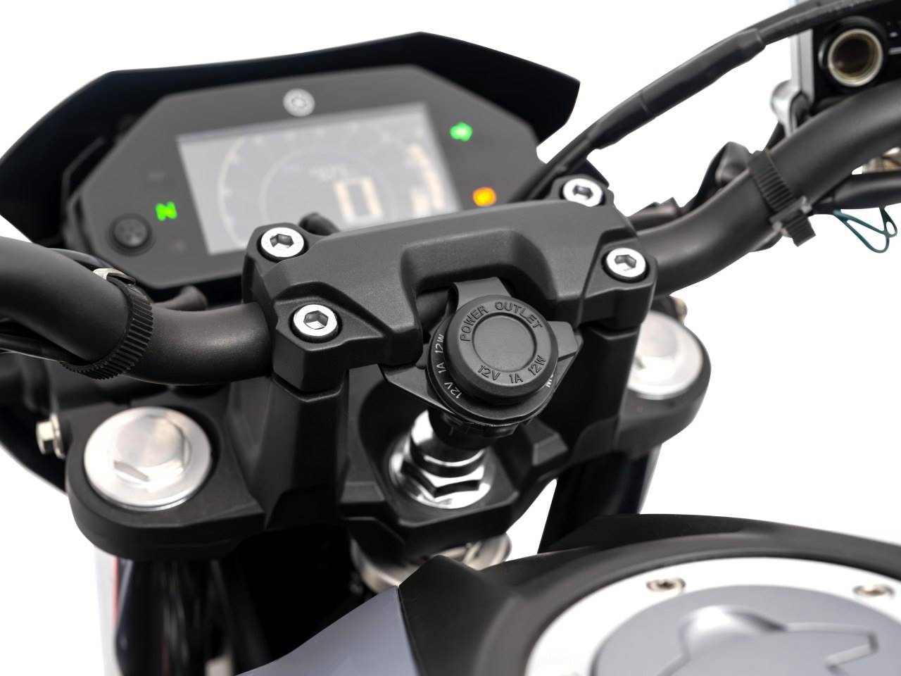 A moto também tem uma tomada 12V na mesa do guidão, que garante ainda mais conveniência para manter os dispositivos eletrônicos sempre carregados.